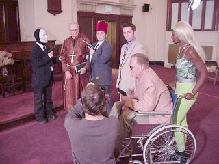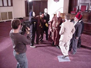 After many, many, MANY unsuccessful attempts in securing a church in the DC/Metro area and because God hates me, the production was forced into using the Johns Hopkins University Non-Denominational Chapel this past Tuesday for filming. The shoot progressed smoothly with the chapel staff only occasionally making cryptic remarks about "our sickening unholy stench." Special thanks to the JHU Film Society for making it happen and to JHU students Rich and Julie for gooning that evening. Schedule-wise, we only have approximately 3 days left. The end...IS NEAR..! |