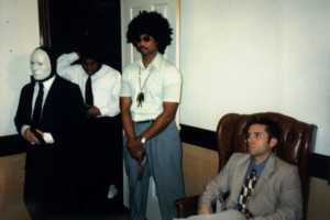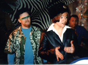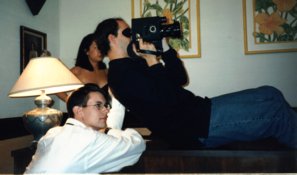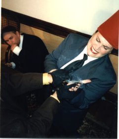Addendum Of course, it goes w/o saying that any mention of this past weekend's shoot would be lacking if we were not to note John Paglio's stellar performance. When not thesping on camera, John would sneak off to break furniture and steal my mother's silverware by hiding them in his pants. The constant jingling and metallic rattle was a dead giveaway and once his scenes were completed, the police were called in to perform a full cavity search of the thieving Paglio. The search yielded not only the missing silverware, but a VCR, assorted tooth whiteners, and two 56 year-old Thai fisherman who had been living in John's lower intestine and subsisting on a diet of beef jerky and urine. Now awaiting extradition to Zimbabwe where he is wanted for various "unnatural acts", John currently resides in the City of Rockville's correctional facility where he amuses all the inmates with his exotic tales of Ancient Persia when they aren't beating him senseless. |