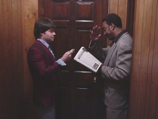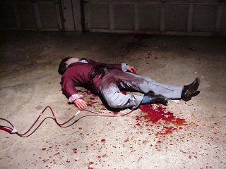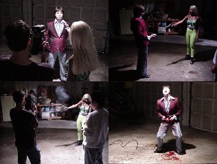 Wow, the end is nearer than near, but that doesn't mean the production still doesn't have its share of snags to deal with. On Saturday... well, let's just say that things didn't work out with the location; I'm still upset about this so in the name of solidarity I request that each and every cast and crew member sneak out of their beds in the dead of night, find the nearest construction site, and smash every goddamn window in the place. Now that's just a request, actually more of an idea, and on second thought you really shouldn't do it. It's just not right. But don't let the rule of law stop you if you feel that construction industry should be savagely punished for their impudence. Who am I to stop you in carrying out your divine unholy retribution? I'd say I'm completely powerless. Sunday, things moved along smoothly and the day was topped off with the film's heartwarming tribute to that eternal children's classic "I Spit On Your Grave" with Magdick losing his joystick in none too pleasant circumstances. Actor Lou Zamicilli had his trousers rigged w/ tubing and the super soaker, and when the time came, it was "Castrato Lou"; unfortunately, it got to be pretty disturbing with Lou demanding multiple takes because he claimed the smell of the stage blood made him "feel dirty, but in a good way" and soon he was dancing a disturbing little jig that was heavy on the pelvic thrusts. It creeped us all out. |