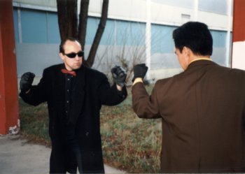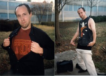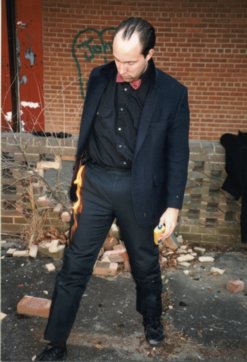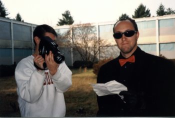 In what will hopefully be the film's last full day of shooting, Action Director Eric Thornett took up the reigns one last time and stepped in front of the camera as special guest killer "Boogaloo Shrimp". Eric wants to thank you all for inflicting this asinine name on him. "Nigel Vendaloo" was second, "Casanova Chang" and "Psycho Bowtie" tied for third, and "Steve" was last with only two votes. Whether the actual name survives the final cut is still up in the air. Eric preferred "Psycho Bowtie" by the way. In any case, Eric went toe-to-toe with Cash Flagg, Jr. in the courtyard of an abandoned Silver Spring high school. Eric easily out-shined sissy-boy Flagg with his shocking agility and reckless disregard for personal safety. The day climaxed with the incredible fire gag, with Eric using a fire-suit which he claimed was designed for Russian cosmonauts for the Mir Space Station; on closer inspection, the suit turned out to be some jogging pants and a thick flannel shirt. Eric soaked his arms and legs with lighter fluid and with a nearby match, Eric burst into a ball of flame, shrieking up a storm as he careened into walls and flailed wildly. In the end, Eric was perfectly okay except for the third degree burns that covered ninety-percent of his body, his charred, scaly skin crackling and flaking with every step he took. "Third degree burns are nothing." Eric boasts, "Last year, I cut off my own head!" |