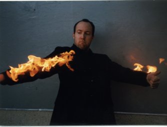 Eric shows off his high-tech flame-retardant burn suit; developed by NASA scientists for the Space Shuttle, this technological wonder can withstand temperatures up to 100 degrees. |