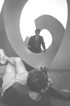 DP / Action Director Eric Thornett waits for Cash to demonstrate his stuntman abilities by jumping through a sculpture at the Bethesda Metro stop. |