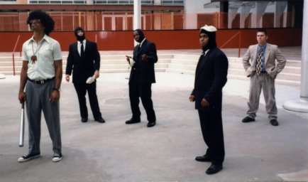 Cast waits to be busted by Metro Security. From L to R: Kris Mickens as Rocco, Pete Seroskie, Ray Cooper & Donald Vick as The Faceless Goons, and Frank Prather as Jack. |